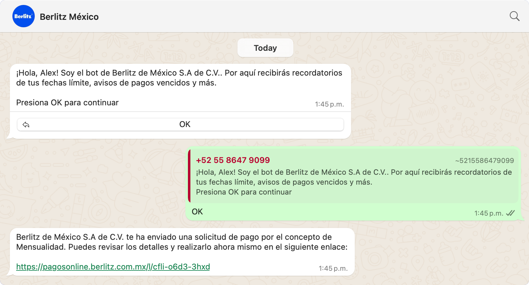 - Todos los mensajes automáticos (recordatorios, recibos, etc.) se enviarán desde tu número dedicado.